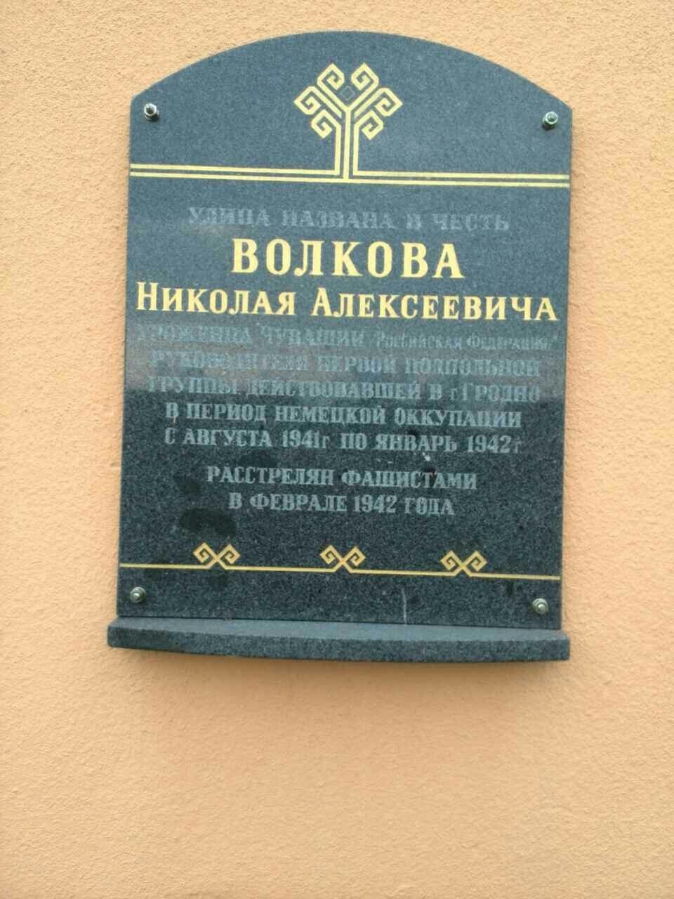Мемориальная доска Волкову Николаю Алексеевичу установлена в 2011 году на доме № 10 по улице Волкова (Дом культуры посёлка Фабричный, затем детско-юношеская спортивная школа). Текст на доске: «Улица названа в честь Волкова Николая Алексеевича уроженца Чувашии (Российская Федерация) руководителя первой подпольной группы, действовавшей в г. Гродно в период немецкой оккупации с августа 1941 г. по январь 1942 г. Расстрелян фашистами в феврале 1942 года».