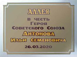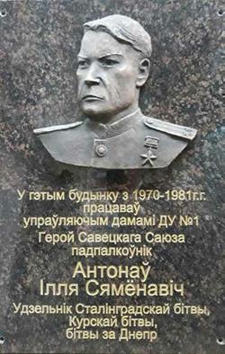 Инициировали исобирали средства на установку доски, посадку сакуровой аллеи сотрудники УЖРЭП Ленинского района вместе со всеми подразделениямиорганизаций жилищно-коммунального хозяйства города. Текст на доске: «У гэтым будынку з 1970–1981 гг. працаваў упраўляючым дамамі ДУ № 1 Герой Савецкага Саюза падпалкоўнік Антонаў Ілля Сямёнавіч, удзельнік Сталінградскай бітвы, Курскай бітвы, бітвы за Днепр».
